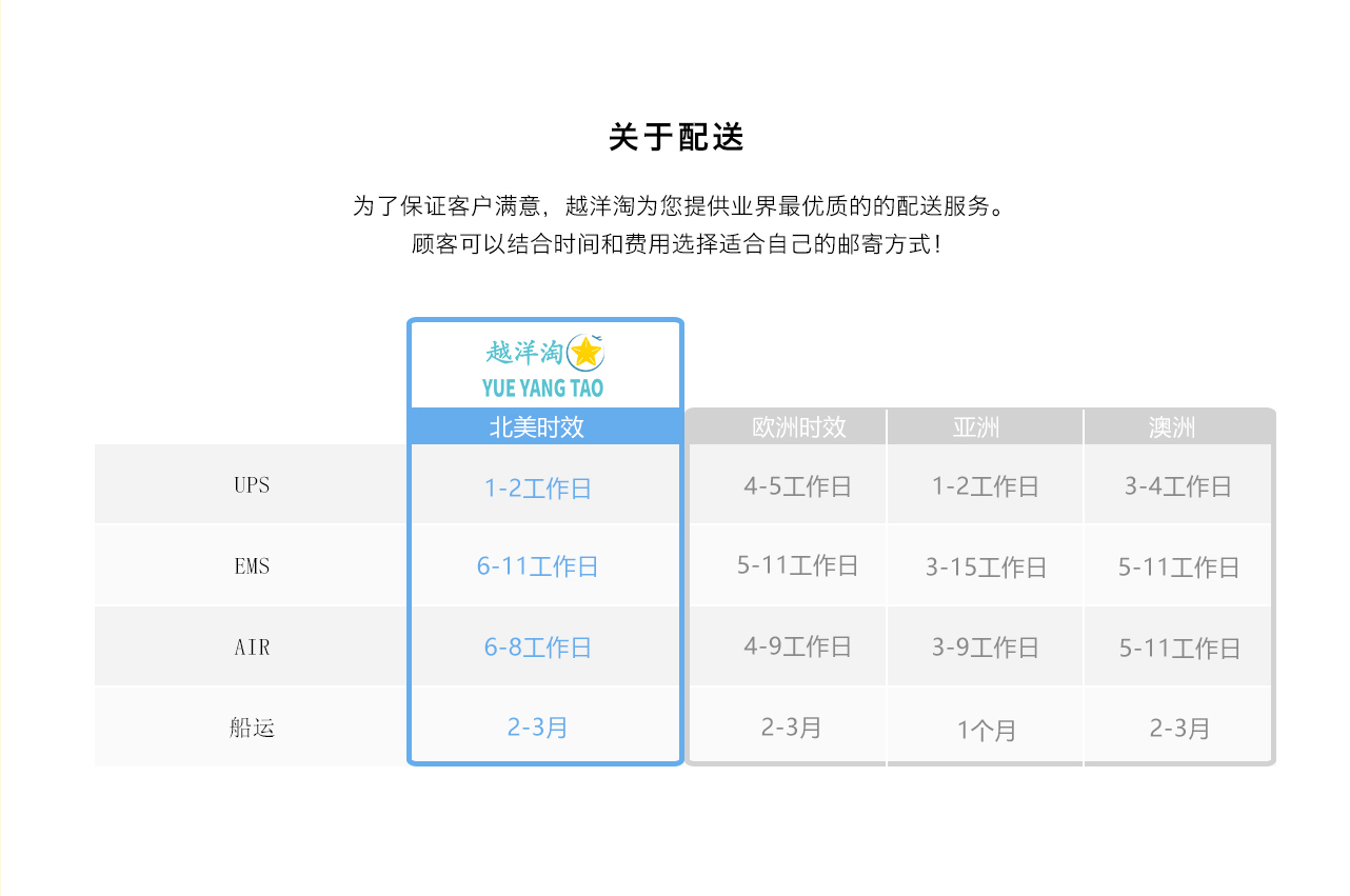 YUE YANG TAO 提供以下的配送方式:UPS / DHL / EMS / 航空 / 海运